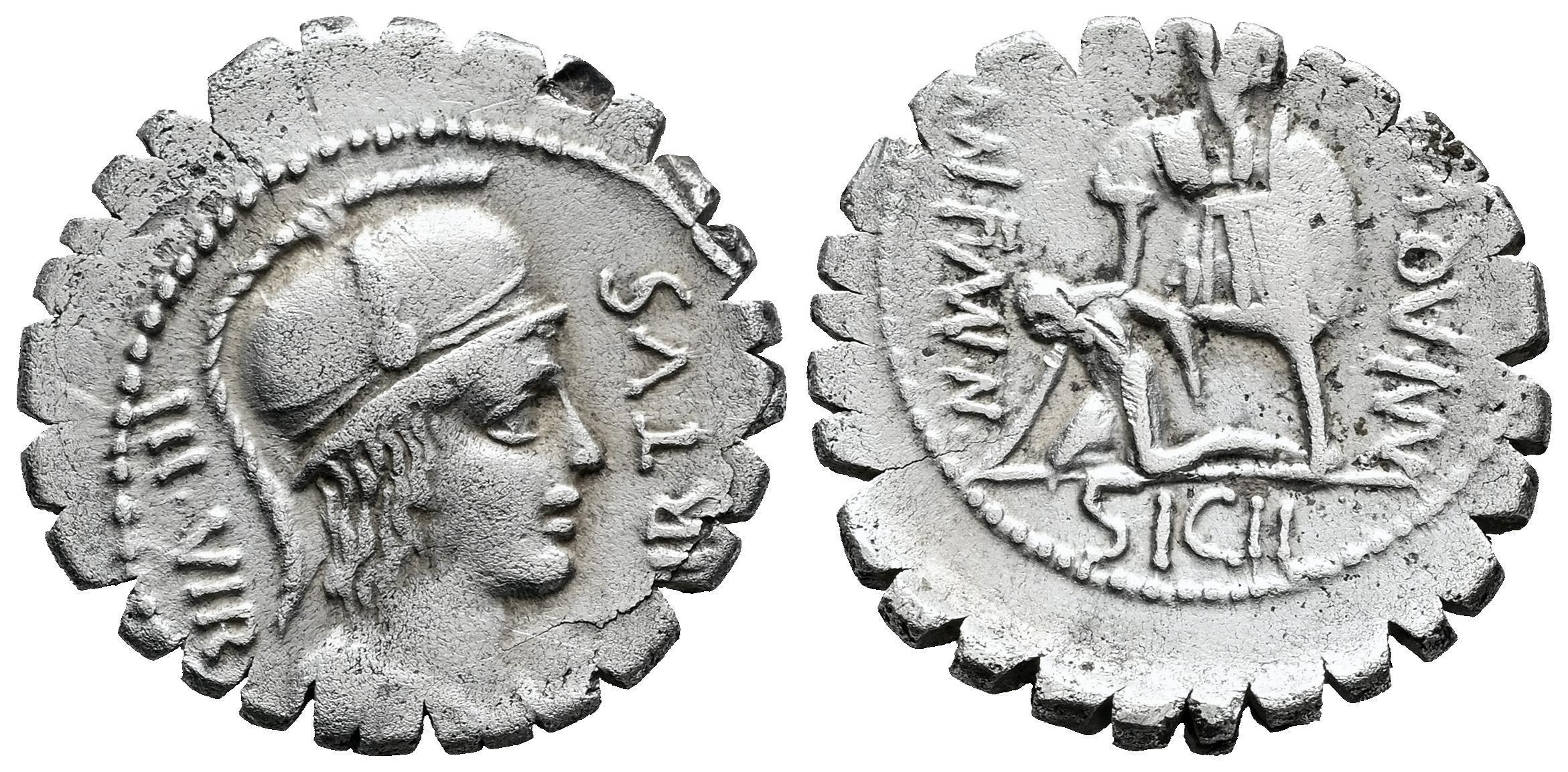 Aqullius. Manius Aquilius Mn.f.Mn.n. Denarius. 71 BC. Uncertain mint. (Ffc-168). (Craw-401/1). Anv.: VIRTUS III VIR or (IIIVIR), helmeted bust of Virtus right, (but low different back part of the helmet of the Virtus). Rev.: Similar, but MN AQVIL MN F MN N., (MN-MN-MN interlace. Ag. 3,88 g. Thin crack. VF. Est...160,00.