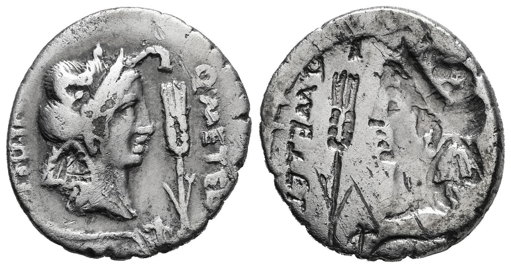 Caecilius. Q. Caecilius Metellus Plus Scipio y M. Eppius. Brockage Denarius. 47-46 BC. Africa. (Ffc-216). (Craw-461/1). (Cal-291). Anv.: Head of Africa right, wearing elephant's skin, corn stalk and Q. METELL before, plough below, SCIPIO. IMP behind. Rev.: Incuse of obverse. Ag. 3,73 g. Scratches on obverse. Scarce. Almost VF/VF. Est...150,00.