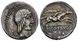 Calpurnius. L. Calpurnius Piso Frugi. Denarius. 90-89 BC. Rome. (Ffc-321). (Cal-312). Anv.: Laureate head of Apolo right, symbol behind head. Rev.: Horseman galloping right, holding palm-branch. L. PISO FRVG (I)., symbol below the horseman. Ag. 3,86 g. Scratches on reverse. VF. Est...80,00.