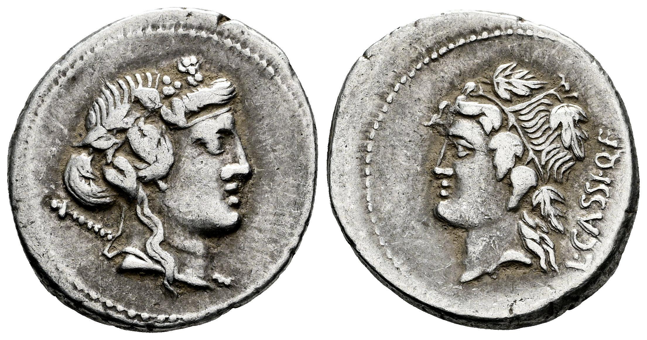 Cassius. L. Cassius Q.f. Longinus. Denarius. 78 BC. Rome. (Ffc-556). (Craw-386/1). (Cal-410). Anv.: Head of Liber or Bacchus right, thyrsus over shoulder. Rev.: Diademed head of Libera Ieft, L. CASSI. Q. F. behind. Ag. 3,97 g. Choice VF. Est...200,00.