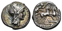 Cipius. M. Cipius M.F. Denarius. 115-114 BC. Uncertain mint. (Ffc-563). (Craw-289/1). (Cal-422). Anv.: Head of Roma right, M. CIPI M.F., before, X behind. Rev.: Victory holding palm, in biga right, rudder below horses, ROMA in exergue. Ag. 3,97 g. Lightly toned with sligthly iridiscent tone. Ex Soler & Llach (14/07/2009), lot 2292. VF. Est...120,00.