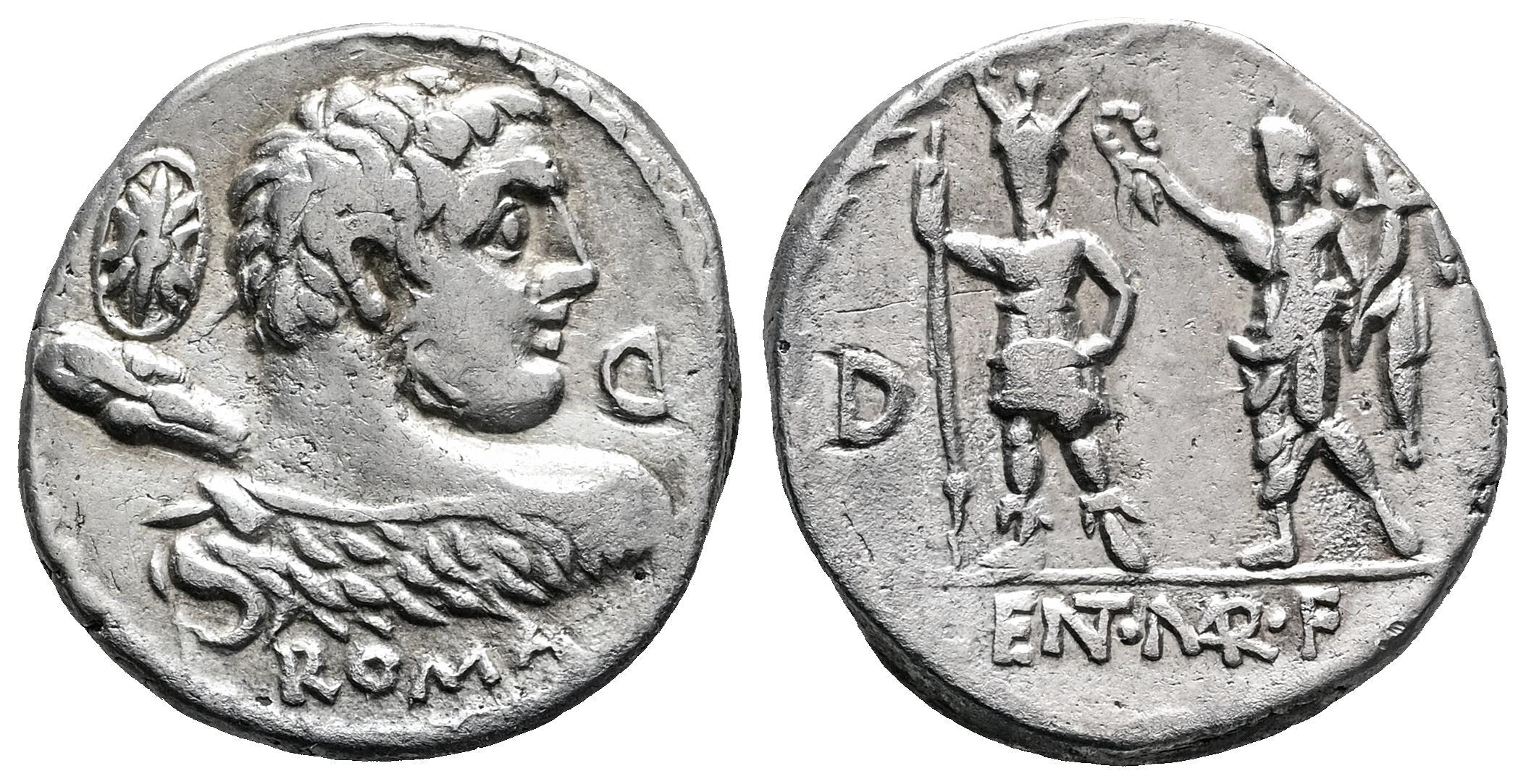 Cornelius. Pub Cornelius Lentulus Marcellinus. Denarius. 100 BC. Auxiliary mint of Rome. (Ffc-618). (Craw-329/1b). (Cal-479). Anv.: Bust of young Hercules right, turned from spectator, wearing lion's skin, club over shoulder, shield and Latin letter ᗡ before, ROMA, below. Rev.: LENT MAR F, (NT y MAR interlace), in exergue. Roma standing facing, being crowned by the Genius of the Roman People, same letter D to left of Roma, all within laurel-wreath. Ag. 391,00 g. Choice VF/VF. Est...160,00.