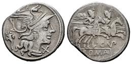 Cupiennius. L. Cupiennius. Denarius. 147 BC. Rome. (Ffc-665). (Craw-218/1). (Cal-530). Anv.: Head of Roma right, X below chin, cornucopiac behind. Rev.: The Dioscuri right, stars above, L. CVP. (VP interlace) below horses, ROMA in exergue. Ag. 3,52 g. Choice F. Est...50,00.