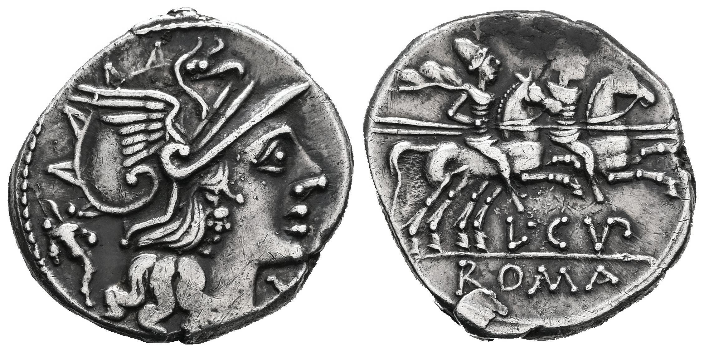 Cupiennius. L. Cupiennius. Denarius. 147 BC. Rome. (Ffc-665). (Craw-218/1). (Cal-530). Anv.: Head of Roma right, X below chin, cornucopiac behind. Rev.: The Dioscuri right, stars above, L. CVP. (VP interlace) below horses, ROMA in exergue. Ag. 4,10 g. Lightly toned. Choice VF. Est...110,00.