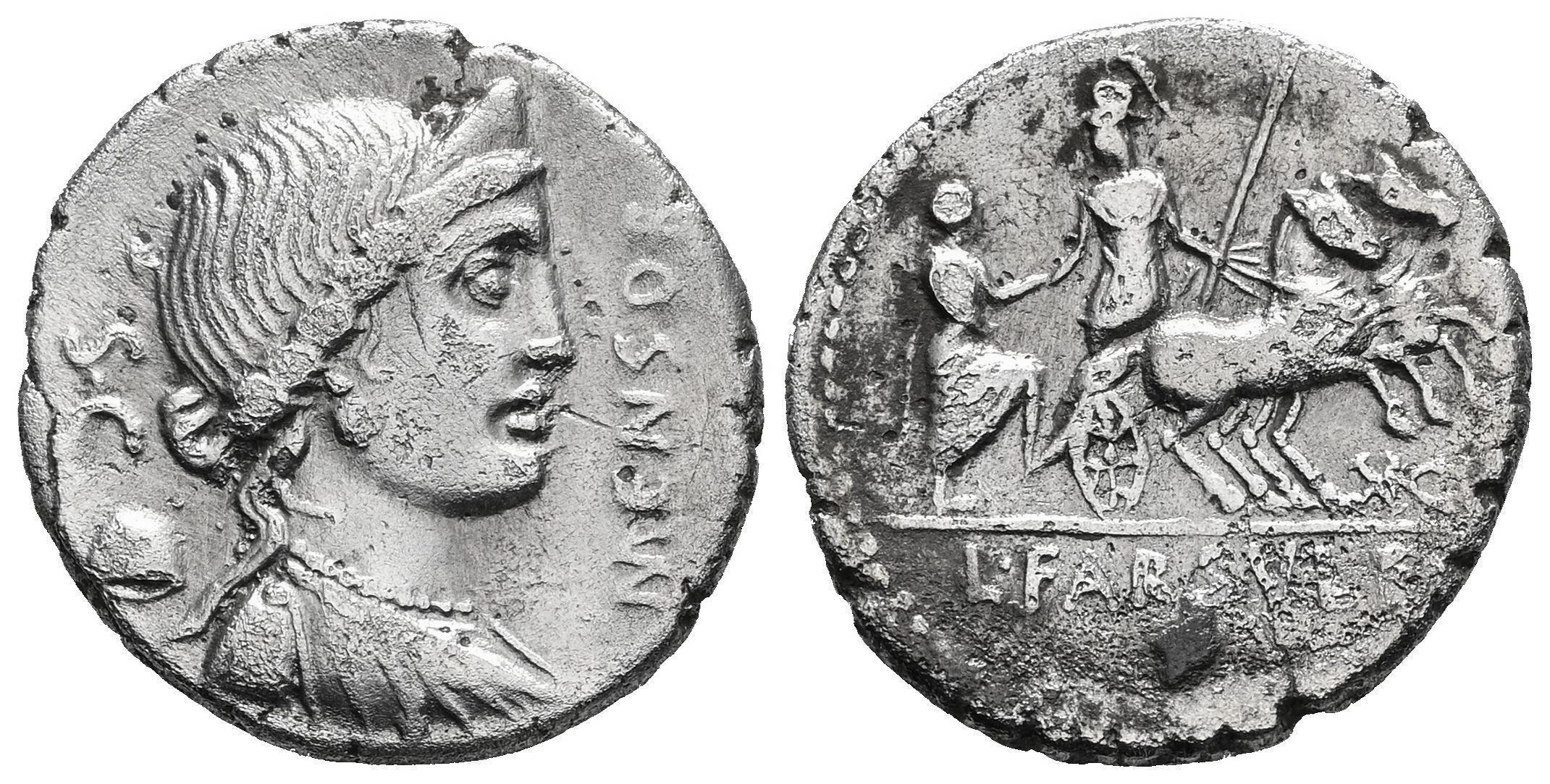 Farsuleius. L. Farsuleius Mensor. Denarius. 75 BC. Rome. (Ffc-706). (Craw-no cita). (Cal-577). Anv.: Diademed and draped bust of Liberty right, S.C below chin. MENSOR., before, cap of Liberty behind. Rev.: Roma in biga right, assisting togate figure to mount into the chariot. number below horse's feet. L. FARSVLEI in exergue. Ag. 3,44 g. Porosities in metal. VF. Est...85,00.