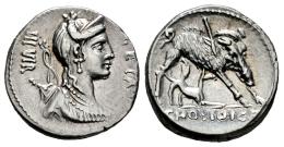Hosidius. C. Hosidius C.f. Geta. Denarius. 68 BC. South of Italy. (Ffc-748). (Craw-407/2). (Cal-618). Anv.: Diademed head of Diana draped right, bow and quiver at her shoulder GETA before, III. VIR behind. Rev.: The wild boar of Calydon right, pierced by spear and attacked by dog. C. HOSIDI. C.F. in exergue. Ag. 3,96 g. Attractive specimen with traces of luster. Almost XF/XF. Est...400,00.