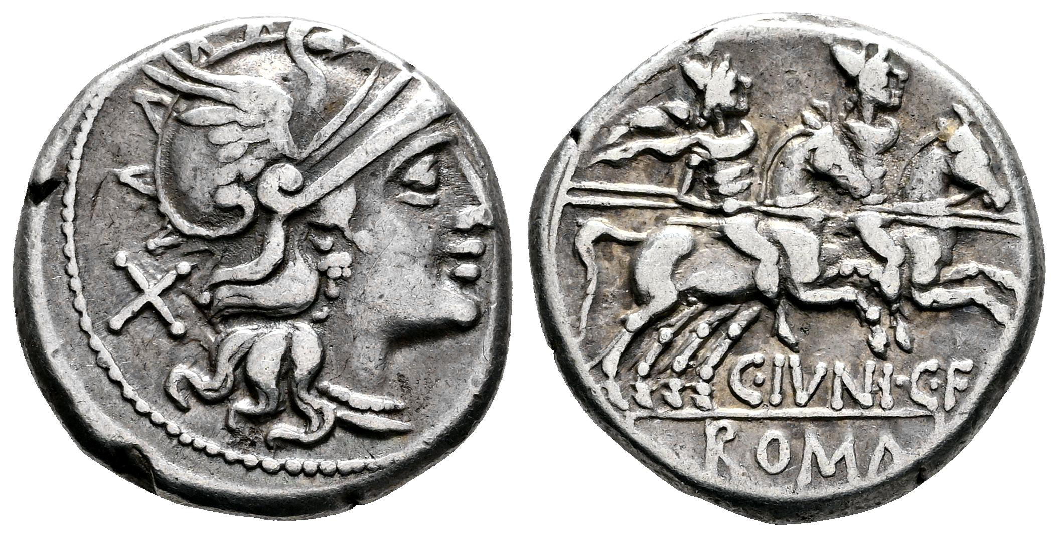 Junius. C. Junius C. f. Denarius. 149 BC. Rome. (Ffc-776). (Craw-210/1). (Cal-859). Anv.: Head of Roma right, X behind. Rev.: The Dioscuri right, stars above, C. IVNI C. F., below horses, ROMA in exergue. Ag. 3,88 g. VF. Est...120,00.