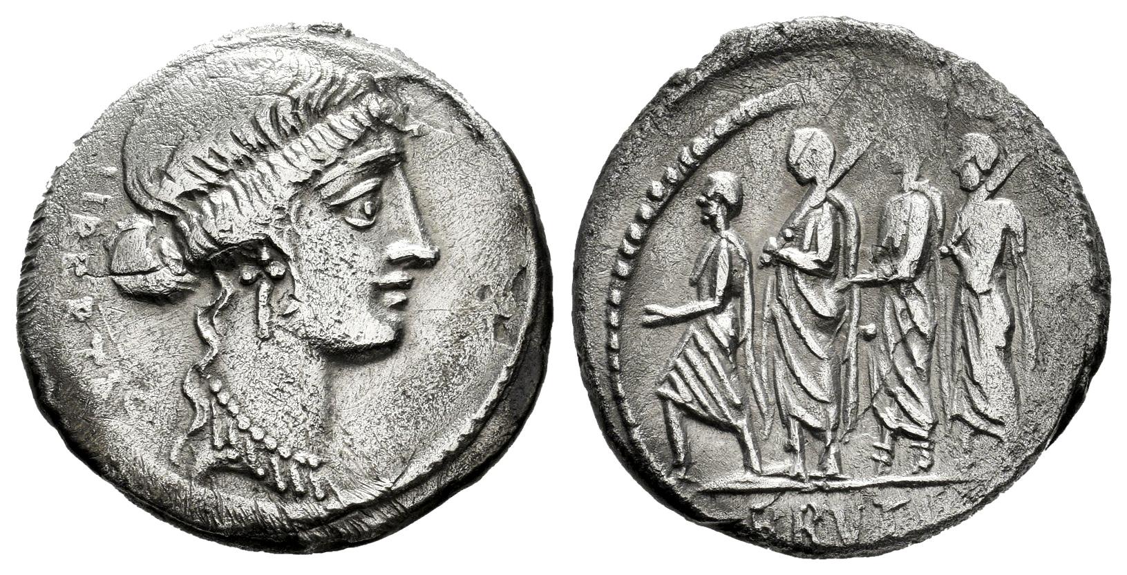 Junius. Q. Caepio Brutus. Denarius. 54 BC. Rome. (Ffc-794). (Craw-433/1). (Cal-873). Anv.: LIBERTAS behind head of Liberty right. Rev.: The consul L. Junius Trutus walking left between two lictors preceded by an accensus, BRVTVS in exergue. Ag. 3,84 g. VF/Choice VF. Est...220,00.
