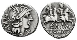 Lucretius. Cnaeus Lucretius Trio. Denarius. 136 BC. Rome. (Ffc-822). (Craw-237/1). (Cal-910). Anv.: TRIO behind head of Roma right, X below chin. Rev.: The Dioscuri right, stars above. CN. LVCR., below horses, ROMA in exergue. Ag. 3,87 g. VF. Est...90,00.