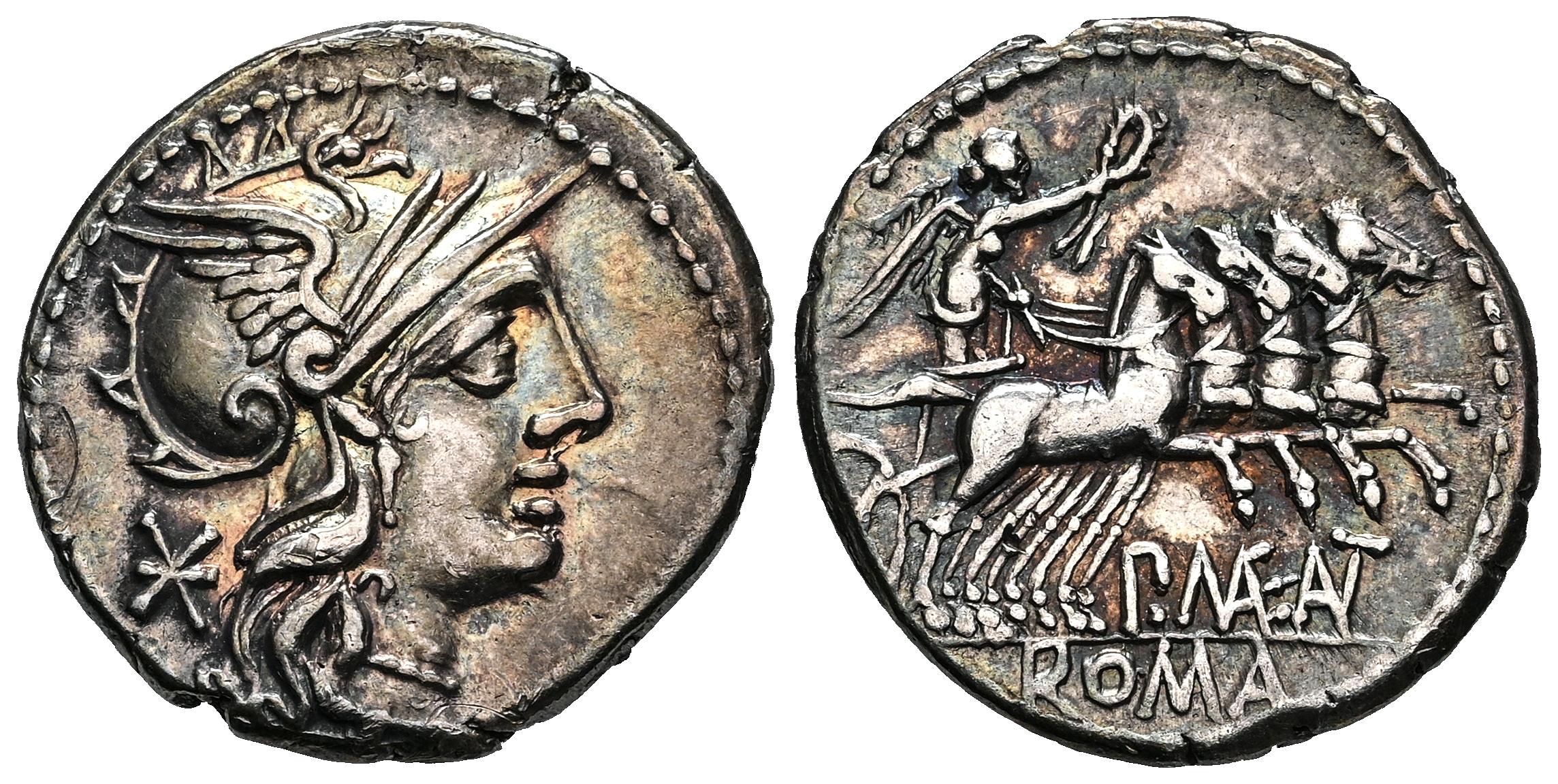 Maenius. Publius Maenius AntiADus. Denarius. 132 BC. Rome. (Ffc-831). (Craw-249/1). (Cal-916). Anv.: Head of Roma right, X behind. Rev.: Victory in quadriga right, P. MAE. ANT., (MAE y ANT interlace), below horses. ROMA in exergue. Ag. 3,89 g. Beautiful monetary patina with iridescent tones. Almost XF/Choice VF. Est...150,00.