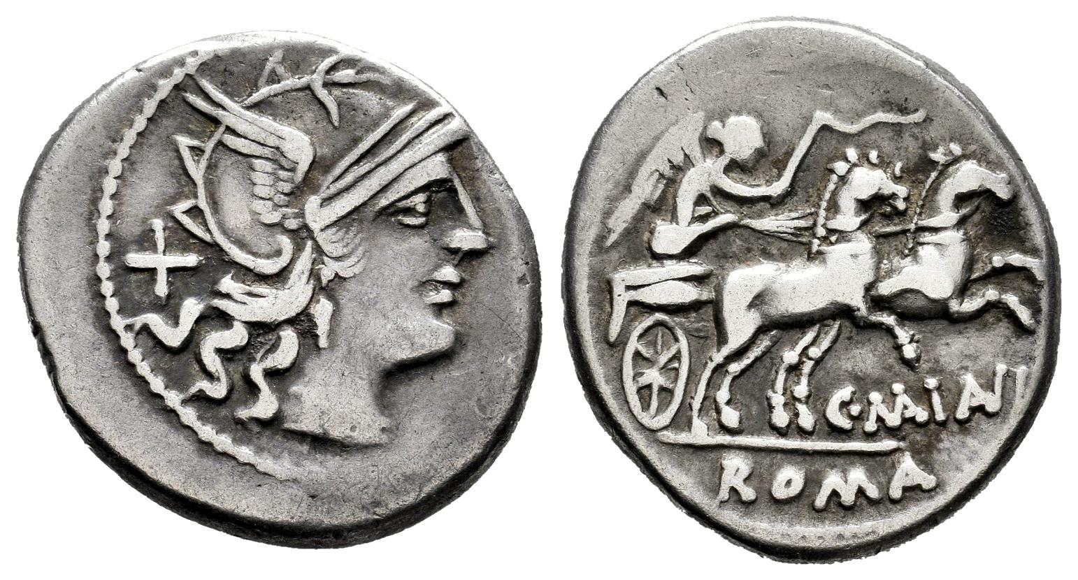 Maianius. C. Maianius. Denarius. 153 BC. Rome. (Ffc-832). (Craw-203/1a). (Cal-917). Anv.: Head of Roma right, X behind. Rev.: Victory in biga right, holding whip, C. MAIANI., (MA y AN interlace), below horses, ROMA in exergue. Ag. 3,93 g. VF. Est...90,00.