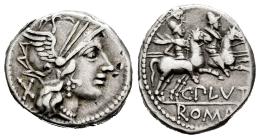 Plutius. C. Plutius. Denarius. 121 BC. Auxiliary mint of Rome. (Ffc-1009). (Craw-278/1). (Cal-1136). Anv.: Head of Roma right, X behind. Rev.: The Dioscuri right, C. PLVT(I)., below, ROMA in exergue. Ag. 3,88 g. Minor marks on obverse. The only denarius of this family. Choice VF. Est...90,00.