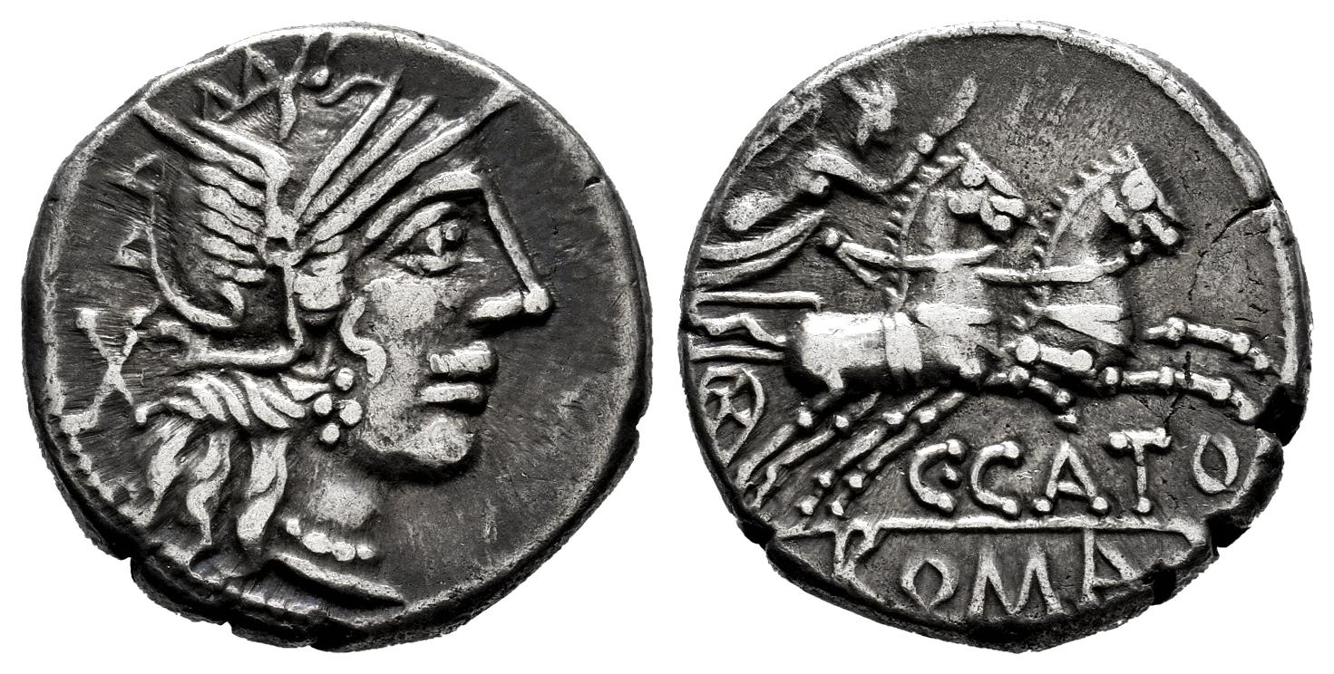 Porcius. C. Porcius Cato. Denarius. 123 BC. Auxiliary mint of Rome. (Ffc-1050). (Craw-274/1). (Cal-1196). Anv.: Head of Roma right, X behind. Rev.: Victory in biga right, holding whip, C. CATO below horses, ROMA in exergue. Ag. 3,89 g. Lightly toned. Choice VF. Est...120,00.