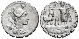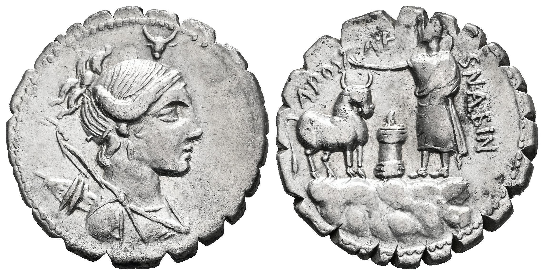 Postumius. A. Postumius A.f. Sp.n. Albinus. Denarius. 81 BC. Auxiliary mint of Rome. (Ffc-1071). (Craw-372/1). (Cal-1215). Anv.: Bust of Diana draped right, bow and quiver on shoulder, bucranium above. Rev.: A. POST. A.F.S.N. ALBIN., (AL interlace), on a rock a togate figure stands Ieft before a lighted altar and sprinkles an ox he is about to sacrifice. Ag. 3,83 g. Choice VF. Est...160,00.