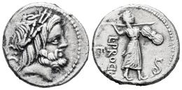 Procilius. L. Procilius f. Denarius. 80 BC. Rome. (Ffc-1083). (Craw-379/1). (Cal-1226). Anv.: Laureate head of Jupiter right, S.C. behind. Rev.: Juno Sospita walking right, hurling spear and holding shield, serpent erect before. L. PROCILI. / F. behind. Ag. 3,81 g. Choice VF. Est...120,00.