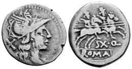 Quinctilius. Sexergue Quinctilius. Denarius. 189-180 BC. Uncertain mint. (Ffc-1087). (Craw-152/1a). (Cal-1229). Anv.: Head of Roma right, X behind. Rev.: The Dioscuri right, SX . Q. below horses, ROMA in exergue. Ag. 3,68 g. Scarce. Almost VF. Est...150,00.