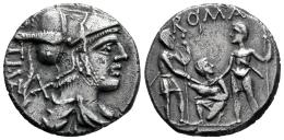 Veturius. Ti. Veturius. Denarius. 137 BC. Central Italy. (Ffc-1186). (Craw-234/1). (Cal-1344). Anv.: Draped bust of Mars right, X and TI. VET., (VET interlace), behind. Rev.: Youth kneeling left, between two warriors who touch with their swords a pig which he holds, ROMA above. Ag. 3,92 g. Choice VF. Est...150,00.