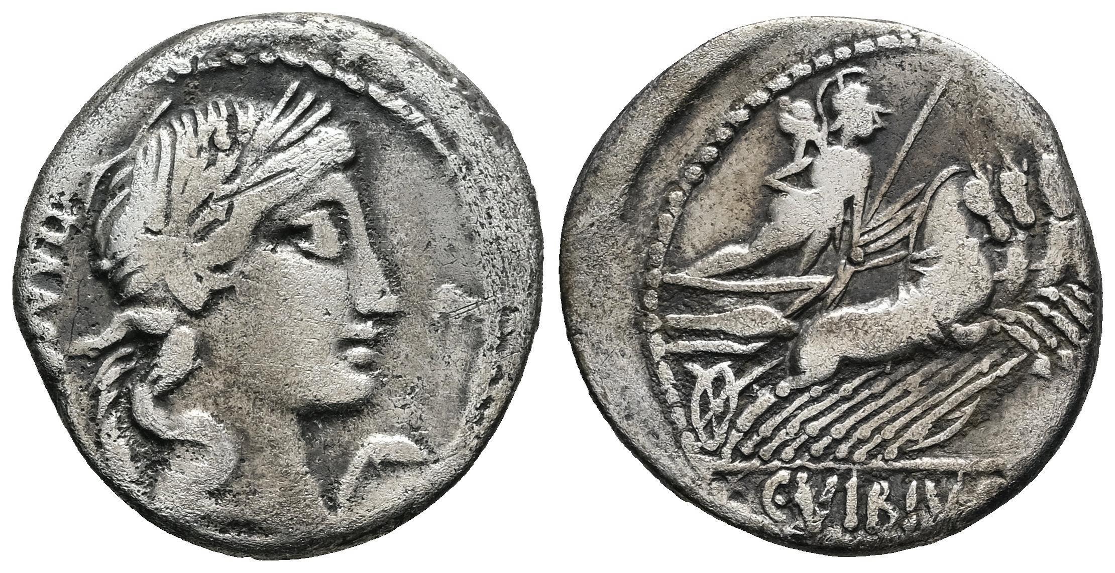 Vibius. C. Vibius C.f. Pansa. Denarius. 90 BC. Auxiliary mint of Rome. (Ffc-1202). (Craw-342/5a). (Cal-1355). Anv.: Large head of Apollo, in low relief, curls, hair in bun, PANSA behind. Rev.: Minerva in quadriga right, Victory flying above quadriga, C. VIBIVS. C.F. in exergue. Ag. 3,80 g. Choice F/Almost VF. Est...80,00.