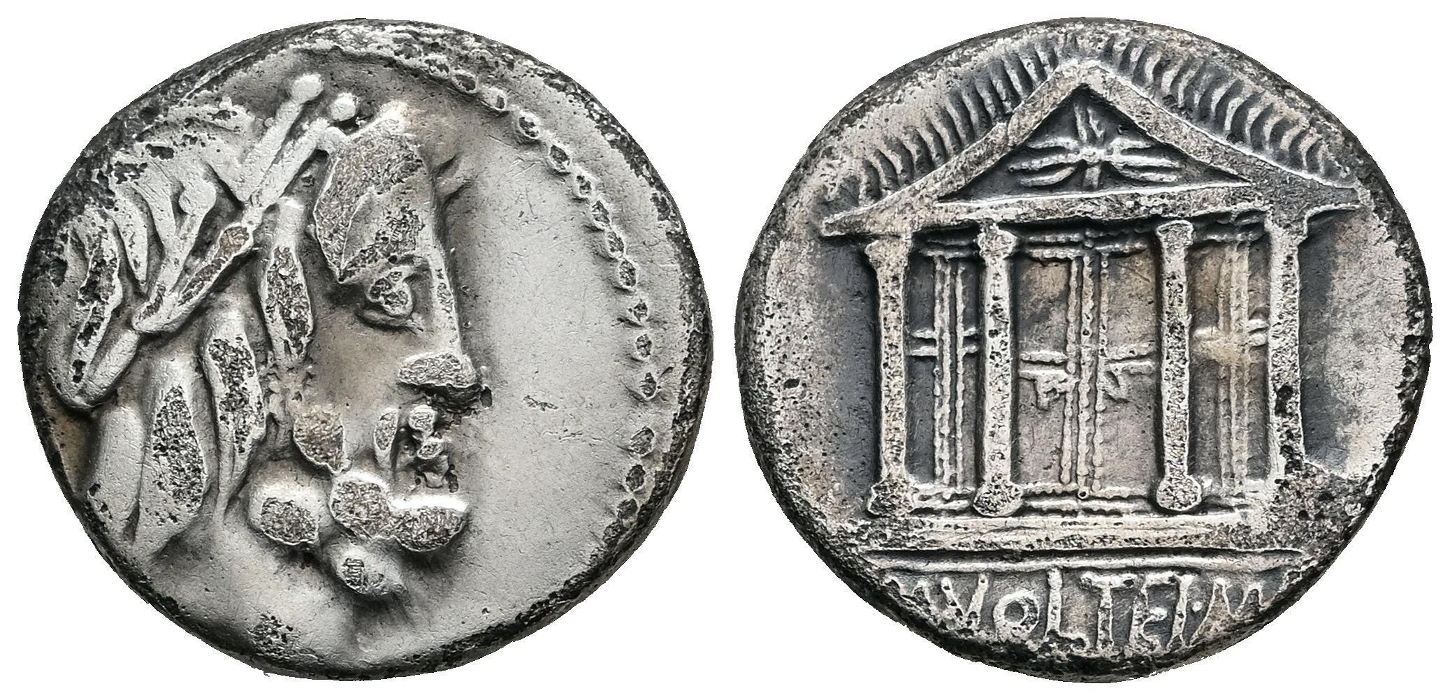 Volteius. M. Volteius M.f. Denarius. 78 BC. Rome. (Ffc-1234). (Craw-385/1). (Cal-1396). Anv.: Laureate head of Jupiter right. Rev.: M. VOLTEI. M. F. below temple of Jupiter Capitolinus. Ag. 3,67 g. Almost VF/VF. Est...85,00.