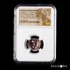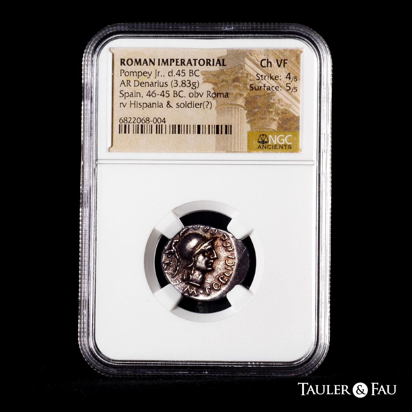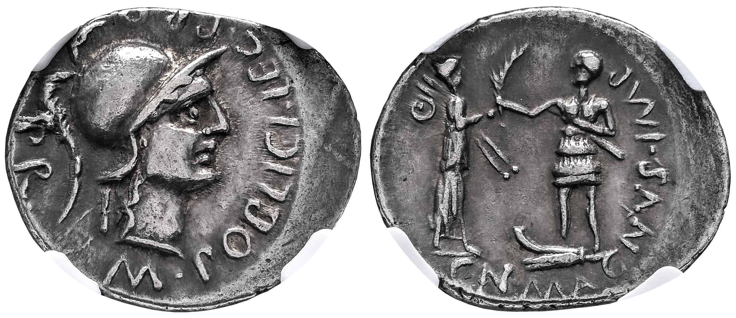 Pompeius Magnus. Cn. Pompeius Magnus y M. Poblicius. Denarius. 46-45 BC. Hispania. (Ffc-1). (Craw-469/a). (Cal-1146). Anv.: M. POBLICI. LEG. PRO. PR. head of Roma right.; bead and reel border. Rev.: CN. MAGNVS IMP., Hispania or Baetica presenting palm to Pompey who is alighting from prow. Ag. 3,83 g. Beautiful patina. Slabbed by NGC as Ch VF, Strike 4/5, Surface 5/5. Est...700,00.