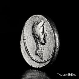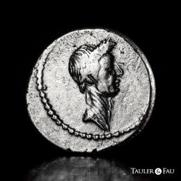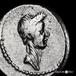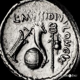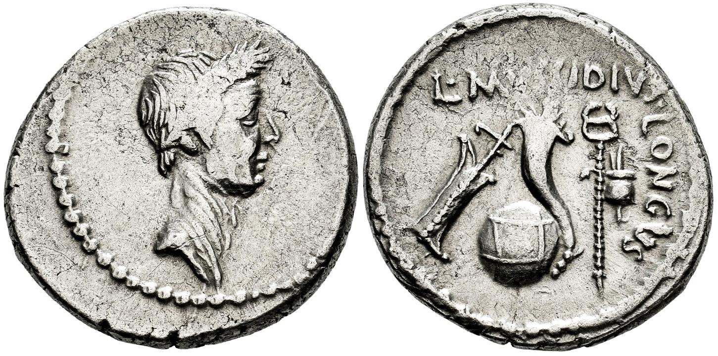 Julius Caesar. L. Mussidius Longus. Denarius. 42 BC. Galia. (Ffc-24). (Craw-494/39a). (Cal-1040). Anv.: Laureate head of Julius Caesar right. Rev.: L. MVSSIDIVS LONGVS. around (arranged in various ways) rudder, cornucopiae on globe, caduceus and priest's hat. . 3,95 g. The portrait of Julius Caesar served as a potent instrument in the propaganda of Antony and Octavian, who were on the verge of confronting Brutus and Cassius when this denarius was minted in 42 B.C. When their massive armies met at Philippi in October of that year, the Caesarian forces emerged victorious, avenging Caesar’s assassination and bringing the Roman world a step nearer to monarchy. While the image of the murdered dictator is striking, the reverse is no less rich in symbolism. The cornucopia set upon a globe and the rudder refer to Caesar’s achievements as a general who placed much of the Mediterranean under his authority; the apex points to his role as Pontifex Maximus; and the winged caduceus can be interpreted as a symbol of the prosperity and stability his conquests were believed to have bestowed upon Rome. With only a few minor exceptions, Octavian made his final major use of Caesar’s portrait in 38 B.C., when he issued remarkable coin types emphasizing his descent from the deified Caesar. Choice VF/Almost XF. Est...4000,00.