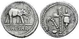 Julius Caesar. Denarius. 54-51 BC. Galia. (Ffc-50). (Craw-443/1). (Cal-640). Anv.: Elephant right, trampling on serpent, CAESAR in exergue. Rev.: Simpulum, sprinkler, axe and priest’s hat. Ag. 3,79 g. Choice VF. Est...1200,00.