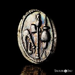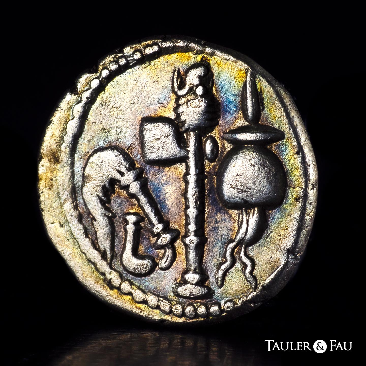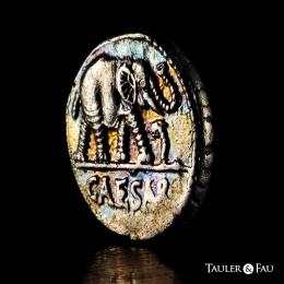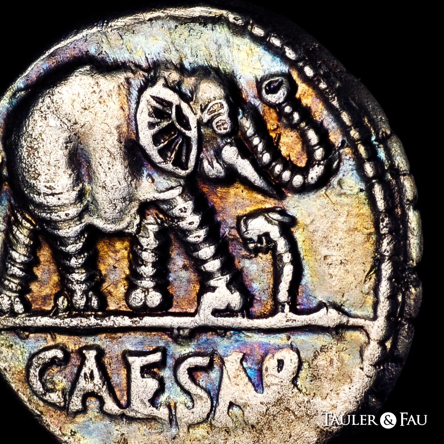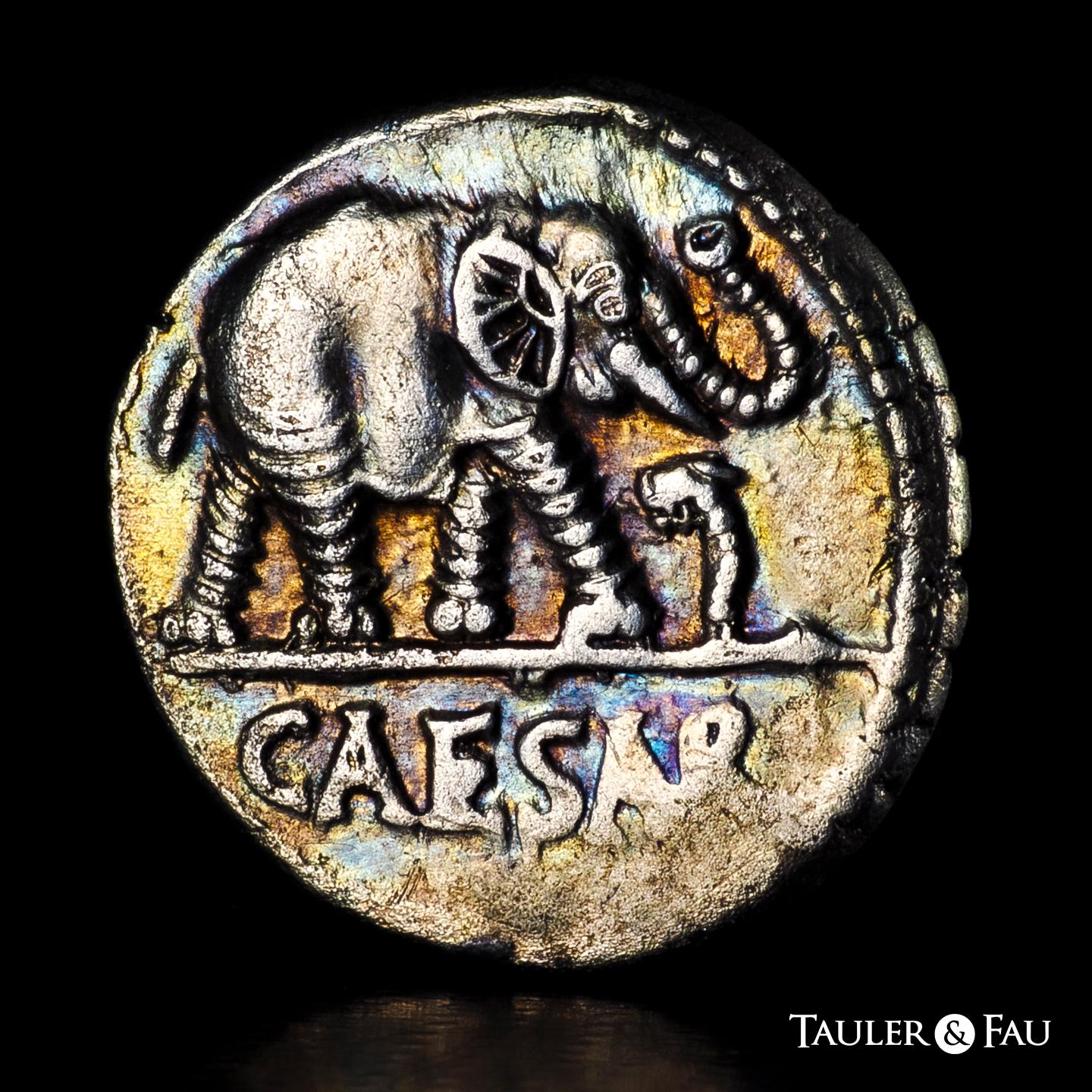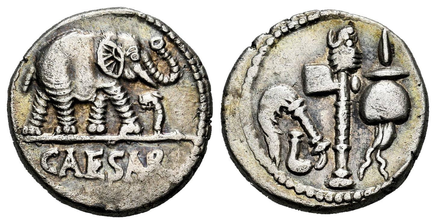 Julius Caesar. Denarius. 54-51 BC. Galia. (Ffc-50). (Craw-443/1). (Cal-640). Anv.: Elephant right, trampling on serpent, CAESAR in exergue. Rev.: Simpulum, sprinkler, axe and priest’s hat. Ag. 4,09 g. Sligthly iridiscent tone. Attractive. Almost XF/VF. Est...700,00.