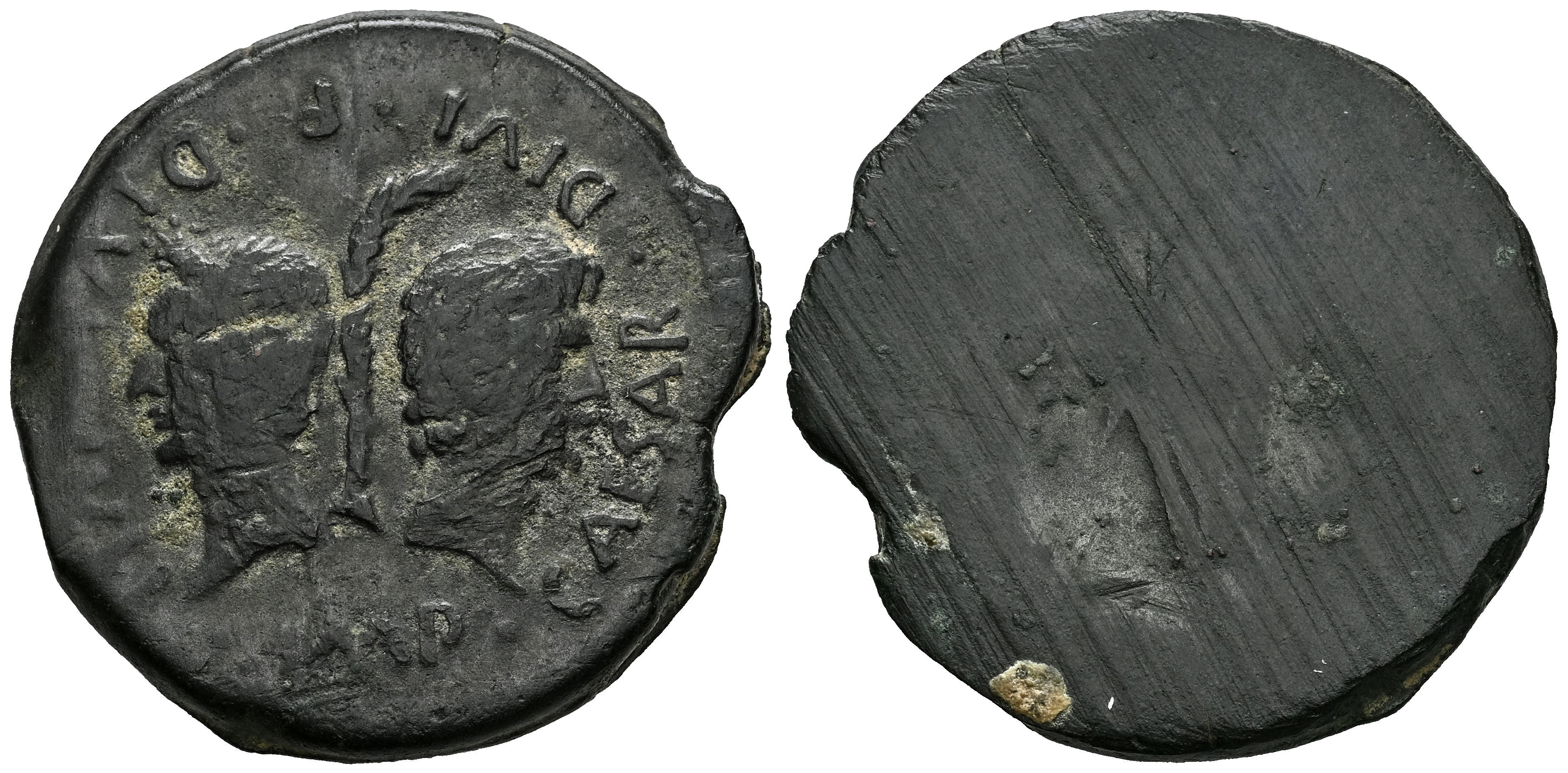 Octavian and Divus Julius Caesar. Dupondius. 36 a.C36 BC. Lugdunum. Gaul. (RPC-I 515). (Sng Cop-690). Anv.: IMP CAESAR DIVI F DIVI IVLI, laureate head of Divus Julius on left and bare head of Octavian on right, back to back; palm frond between. Rev.: The reverse side has not been minted or has been removed during its time. Ae. 20,14 g. Rare. Ex Soler & Llach 1099 (2610/2017), lot 108. VF. Est...150,00.