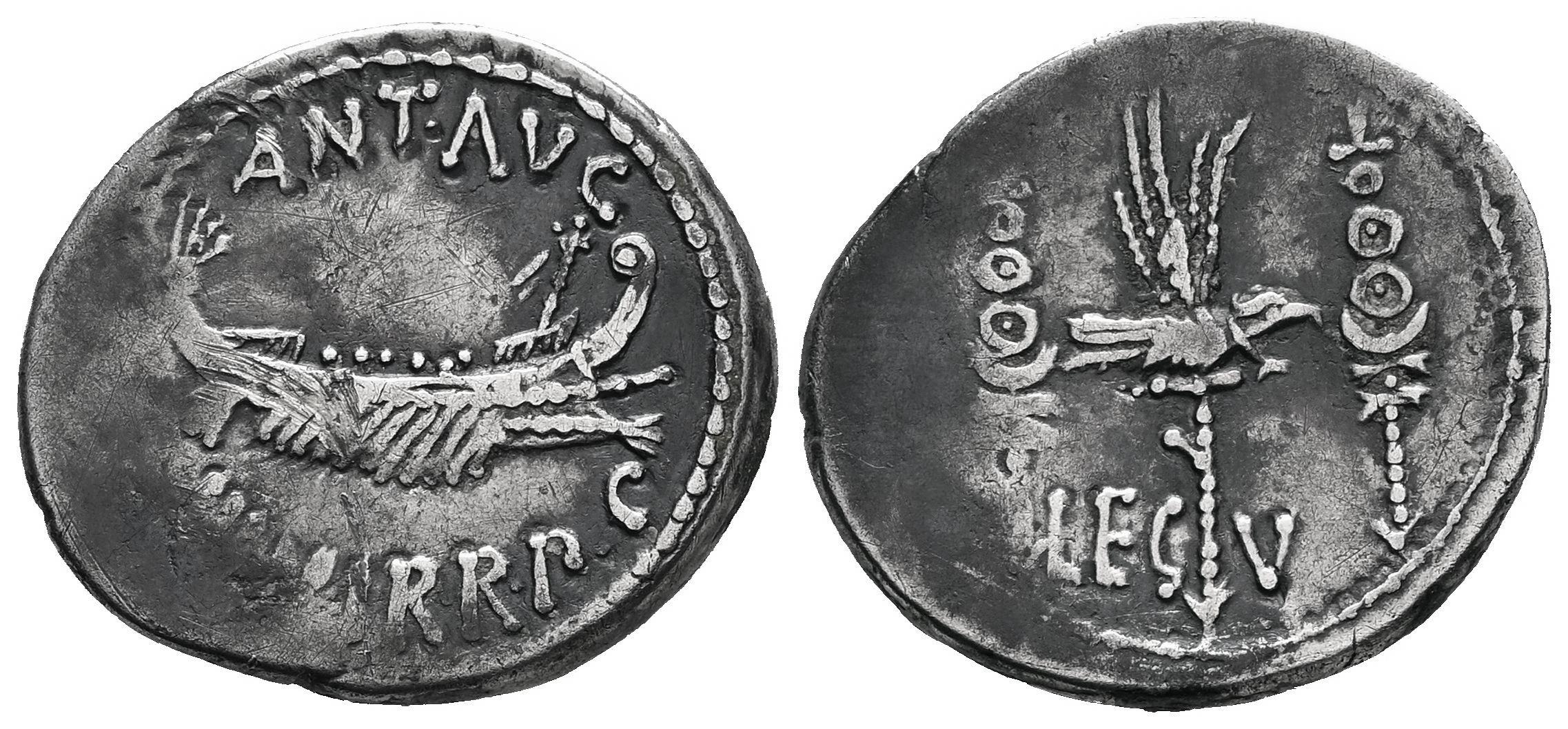 Mark Antony. Denarius. 32-31 BC. Mint moving. (Ffc-36). (Craw-544/18). (Cal-183). Anv.: ANT. AVG. III. VIR. R.P.C. praetorian galley right. Rev.: LEG. V., legionary eagle between two standards. Ag. 3,60 g. VF. Est...250,00.