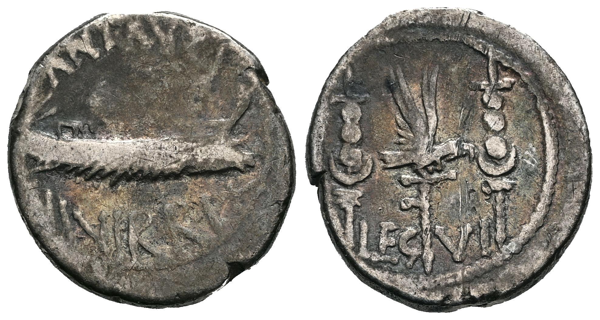 Mark Antony. Denarius. 32-31 BC. Mint moving. (Ffc-37). (Craw-544/19). (Cal-184). Anv.: ANT. AVG. III. VIR. R.P.C. praetorian galley right. Rev.: LEG. VI, legionary eagle between two standards. Ag. 3,35 g. Lightly toned. Hairlines. F/Almost VF. Est...100,00.