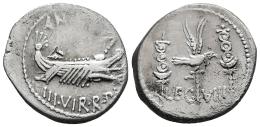 Mark Antony. Denarius. 32-31 BC. Mint moving. (Ffc-39). (Craw-544/21). (Cal-186). Anv.: AN(T. AVG.) III. VIR. R.P.C. praetorian galley right. Rev.: LEG. VIII., legionary eagle between two standards. Ag. 3,44 g. Obverse banker mark. Choice VF. Est...200,00.