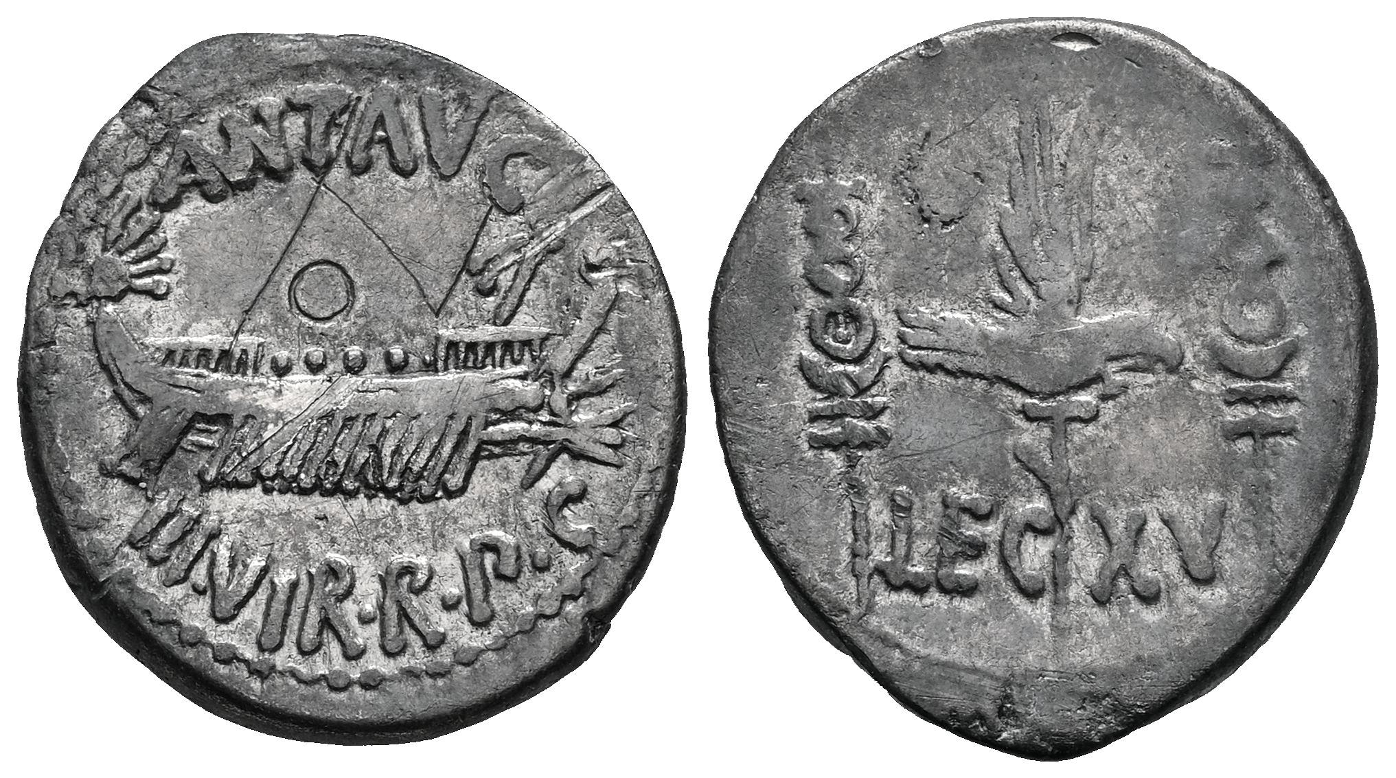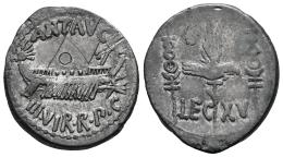 Mark Antony. Denarius. 32-31 BC. Mint moving. (Ffc-50). (Craw-544/30). (Cal-198). Anv.: ANT. AVG. III. VIR. R.P.C. praetorian galley right. Rev.: LEG. XV., legionary eagle between two standards. Ag. 3,52 g. Obverse banker mark. Some scratches. VF/Almost VF. Est...180,00.