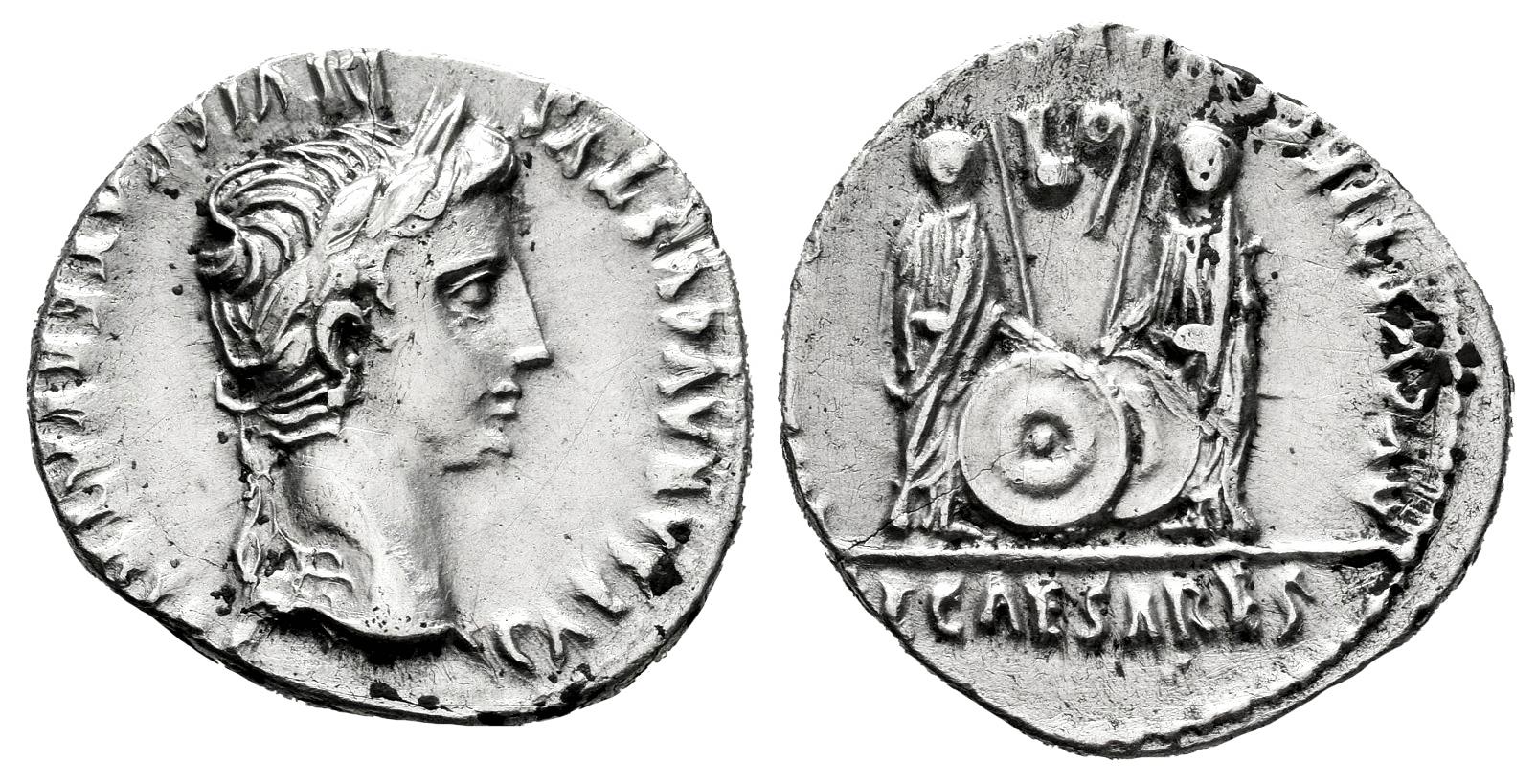 Augustus. Denarius. 7-6 a. C. Lugdunum. (Ffc-22). (Ric-207). (Cal-852). Anv.: CAESAR AVGVSTVS DIVI. F. PATER. PATRIE, his laureate head right. Rev.: C.L. CAESARES AVGVSTI. F. COS. DES(IG. PRINC. IVVENT), Caius and Lucius Caesars standing facing, shields and spears between them; above, between the spears, simpulum and lituus turned inwards. Ag. 3,66 g. Pleasant portrait for this type. Beautiful. Almost XF/Choice VF. Est...250,00.