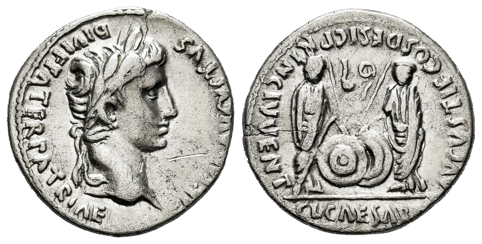 Augustus. Denarius. 7-6 a. C. Lugdunum. (Ffc-22). (Ric-207). (Cal-852). Anv.: CAESAR AVGVSTVS DIVI. F. PATER. PATRIE, his laureate head right. Rev.: C.L. CAESARES AVGVSTI. F. COS. DESIG. PRINC. IVVENT, Caius and Lucius Caesars standing facing, shields and spears between them; above, between the spears, simpulum and lituus turned inwards. Ag. 3,82 g. Thin crack. Hairline on obverse. Choice VF. Est...250,00.