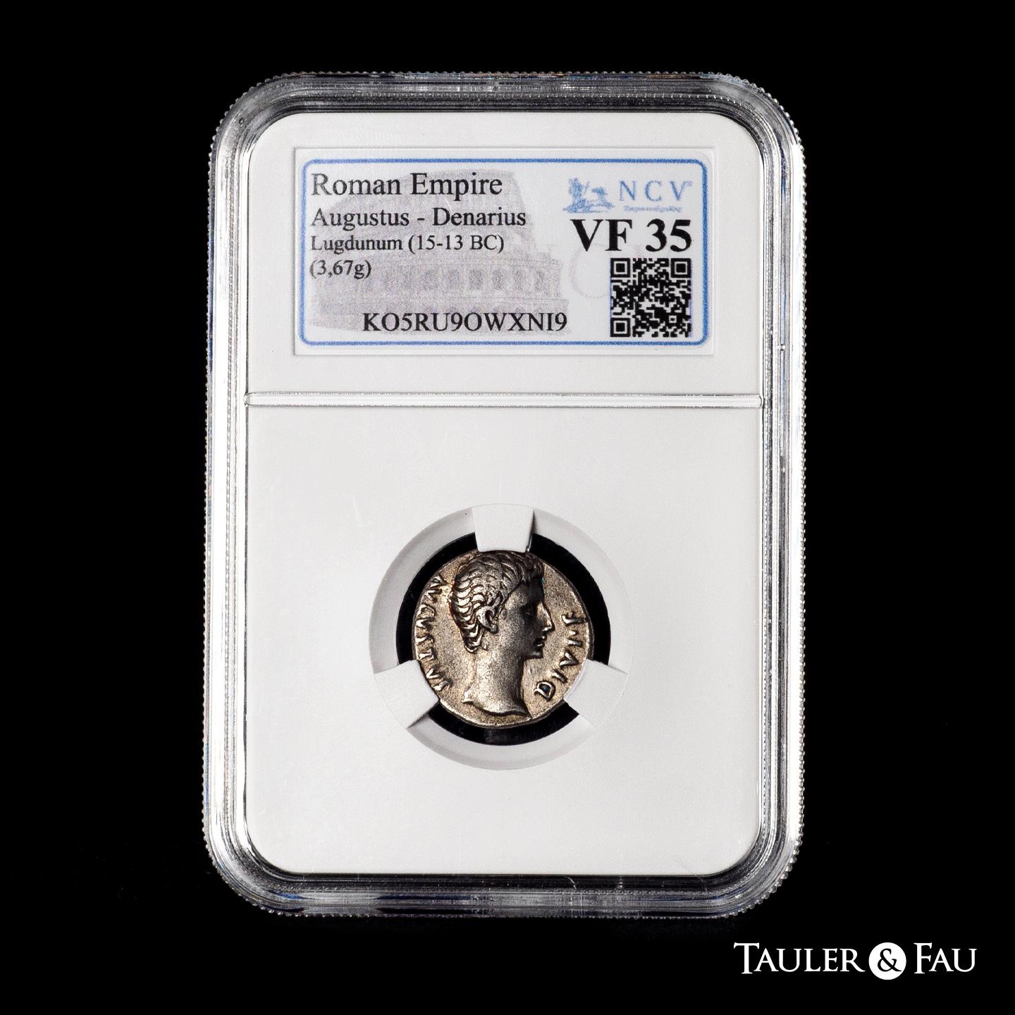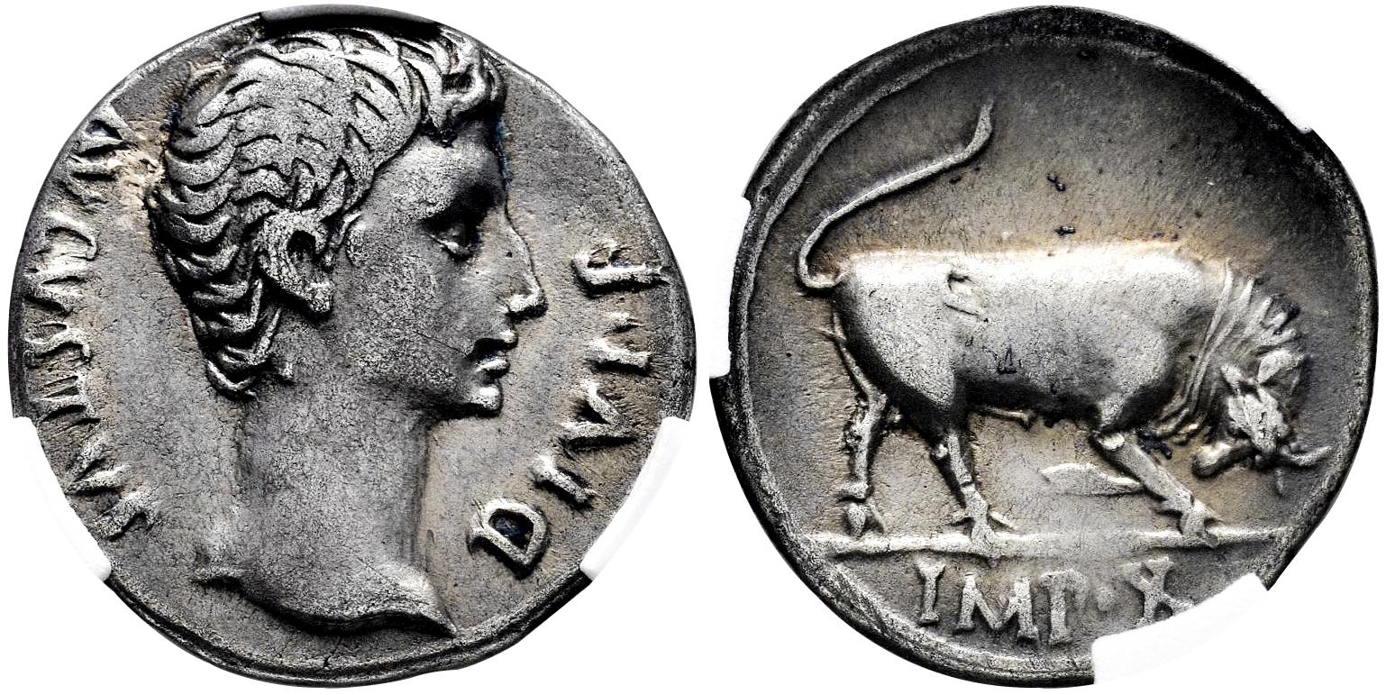 Augustus. Denarius. 15-13 BC. Lugdunum. (Ffc-108). (Ric-167a). (Cal-826). Anv.: AVGVSTVS DIVI. F. bare head of Augustus right. Rev.: IMP. X. in exergue, bull butting right. Ag. 3,67 g. Slabbed by NCV as VF 35. Ex Áureo&Calicó (16/03/2023), lot 1007; Áureo&Calicó (11/12/2014), lot 75. Est...600,00.