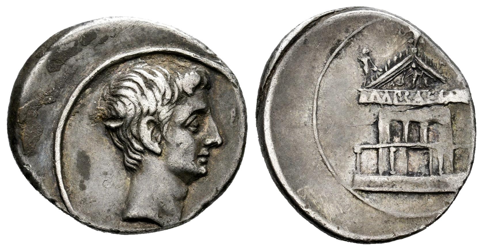 Augustus. Denarius. 29-27 BC. Uncertain mint in Italy (Rome?). (Ffc-96). (Ric-266). (Cal-684). Anv.: Bare head of Augustus right. Rev.: IMP. CAESAR on temple surrounded by a balustrade. Ag. 3,94 g. Delicate patina. Sligthly iridiscent tone. Slight deposits. Choice VF. Est...350,00.