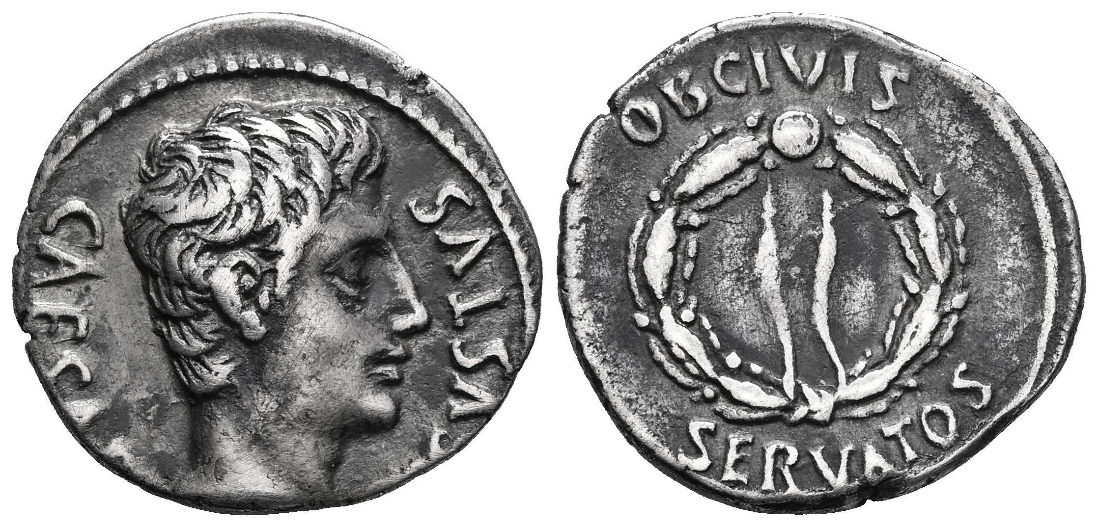 Augustus. Denarius. 19-18 BC. Caesar Augusta (Zaragoza). (Ffc-159). (Ric-75a). (Cal-762). Anv.: CAESA(R AVG)VSTVS bare head of Augustus right. Rev.: OB. CIVIS above and SERVATOS below the oak-wreath. Ag. 3,60 g. VF. Est...300,00.