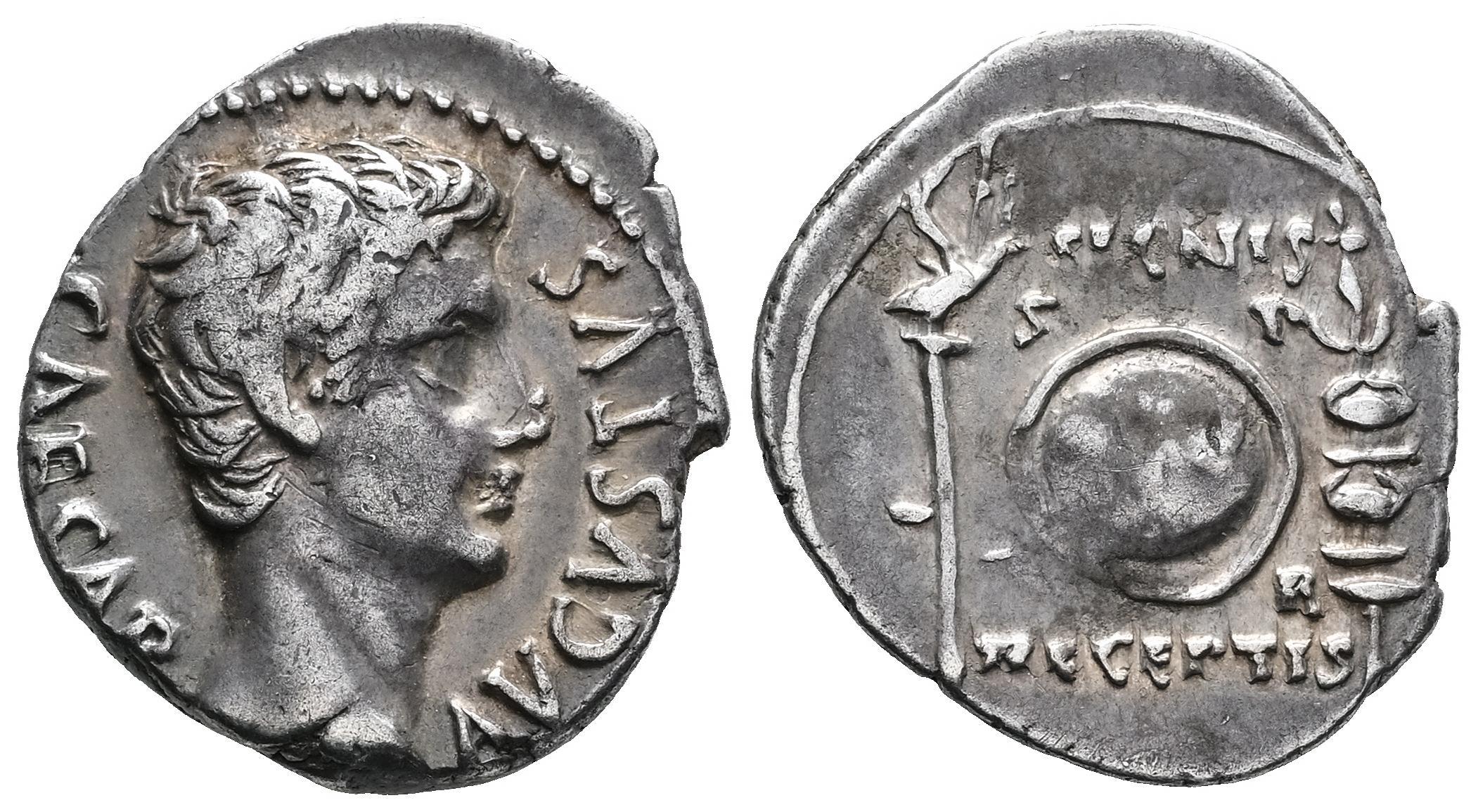Augustus. Denarius. 19 BC. Colonia Patricia (Córdoba). (Ffc-181). (Ric-86a). (Cal-749). Anv.: CAESAR AVGVSTVS bare head of Augustus right. Rev.: SIGNIS RECEPTIS above and below S.P.Q.R. around shield inscribed CL. V., Roman eagle on Ieft and standard on right. Ag. 3,78 g. Lightly toned. VF. Est...250,00.