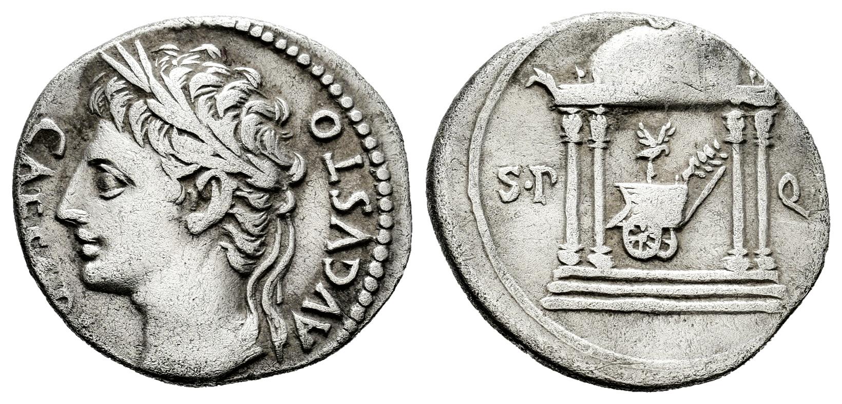 Augustus. Denarius. 18 BC. Colonia Patricia (Córdoba). (Ffc-196). (Ric-119). (Cal-740). Anv.: CAESARI AVGVSTO laureate head of Augustus right. Rev.: S.P. - Q.(R). across field, round temple of four columns, within which chariot surmounted by small quadriga and Roman eagle. Ag. 3,63 g. Slightly cleaned. Very scarce. VF/Almost VF. Est...250,00.
