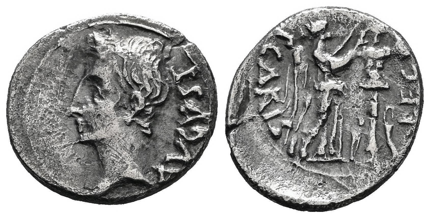 Augustus. P. Carisius. Quinarius. 25-23 BC. Emerita Augusta (Mérida). (Ric-1b). (Rsc-387). Anv.: AVGVST, bare head to left. Rev.: P CARISI LEG, Victory standing right, crowning trophy; dagger and curved sword at base. Ag. 1,66 g. Choice VF. Est...100,00.