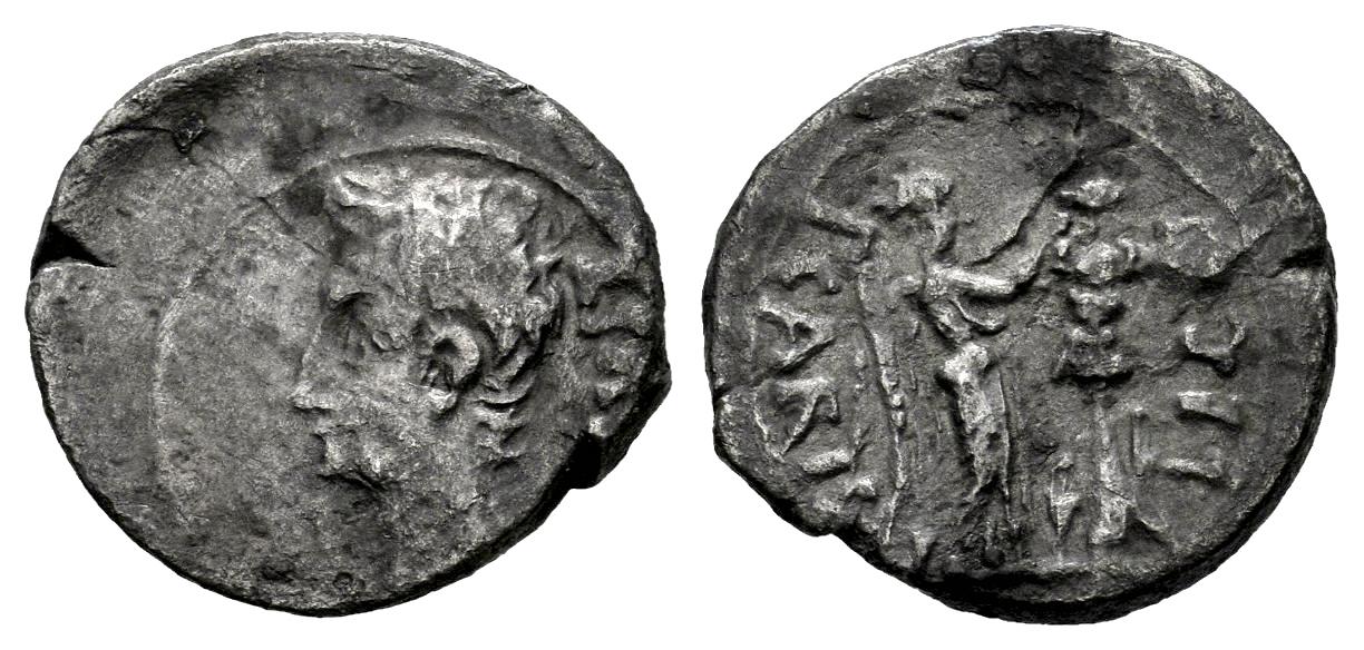 Augustus. P. Carisius. Quinarius. 25-23 BC. Emerita Augusta (Mérida). (Ric-1b). (Rsc-387). Anv.: AVGVST, bbare head to left. Rev.: P CARISI LEG, Victory standing right, crowning trophy; dagger and curved sword at base. Ag. 1,44 g. Slight patina. Almost VF/VF. Est...60,00.