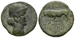 Augustus. AE 16. 10 BC. Galia. Area of Reims. (Ric-I 249). (LT-9248). Anv.: Diademed male head to right. Rev.: Bull butting to left, with foreleg raised; GERMANVS above, INDVTILLI L(ibertvs) in exergue . Ae. 3,34 g. Choice VF. Est...120,00.