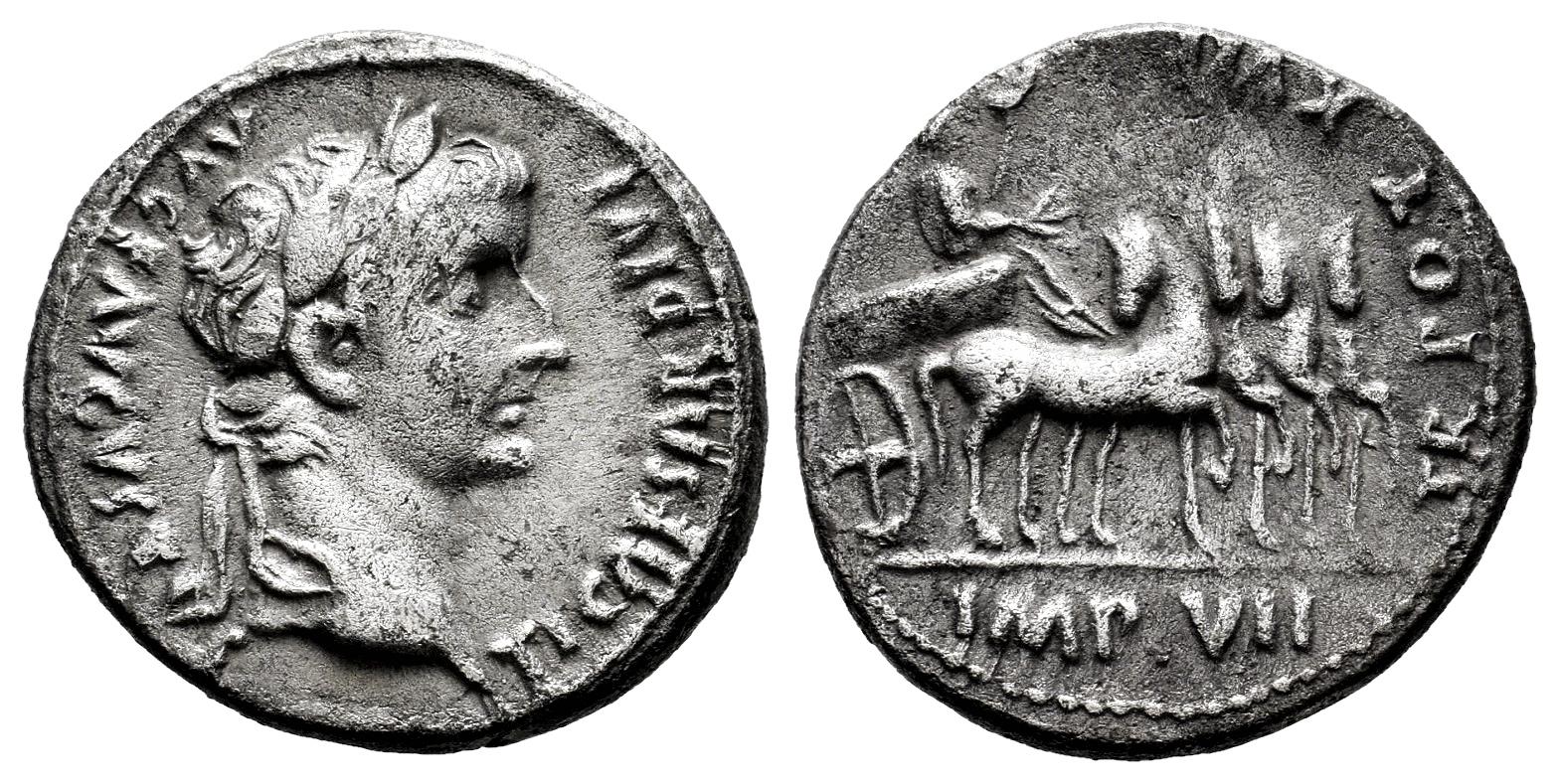 Tiberius. Denarius. 15-16 AD. Lugdunum. (Ric-I 4). (Bmcre-7). (Rsc-48). Anv.: TI CAESAR DIVI AVG F AVGVSTVS, laureate head right. Rev.: TR POT XVII, Tiberius, laureate and cloaked, standing in slow quadriga right, holding laurel branch and eagle-tipped sceptre; the horses' heads all turned right, IMP VII in exergue. Ag. 3,62 g. Delicate patina. Scarce. VF. Est...400,00.