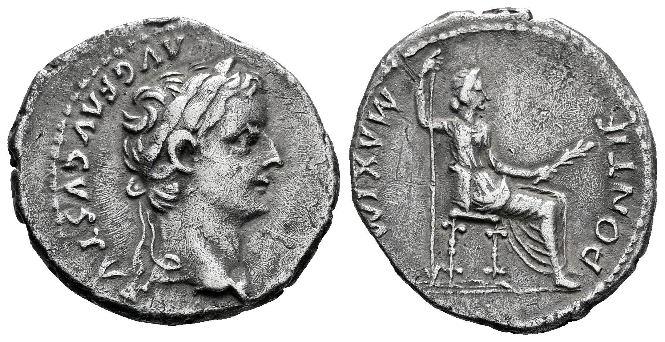Tiberius. Denarius. 14-37 AD. Lugdunum. (Ric-I 28). (Bmcre-42). (Rsc-16b). Anv.: (TI CAESAR DIVI) AVG F AVGVSTVS, laureate head to right. Rev.: PONTIF MAXIM, Livia, as Pax, seated to right on throne with ornamented legs, holding sceptre and branch; triple exergual line below. Ag. 3,47 g. Soft tone. VF/Choice VF. Est...150,00.