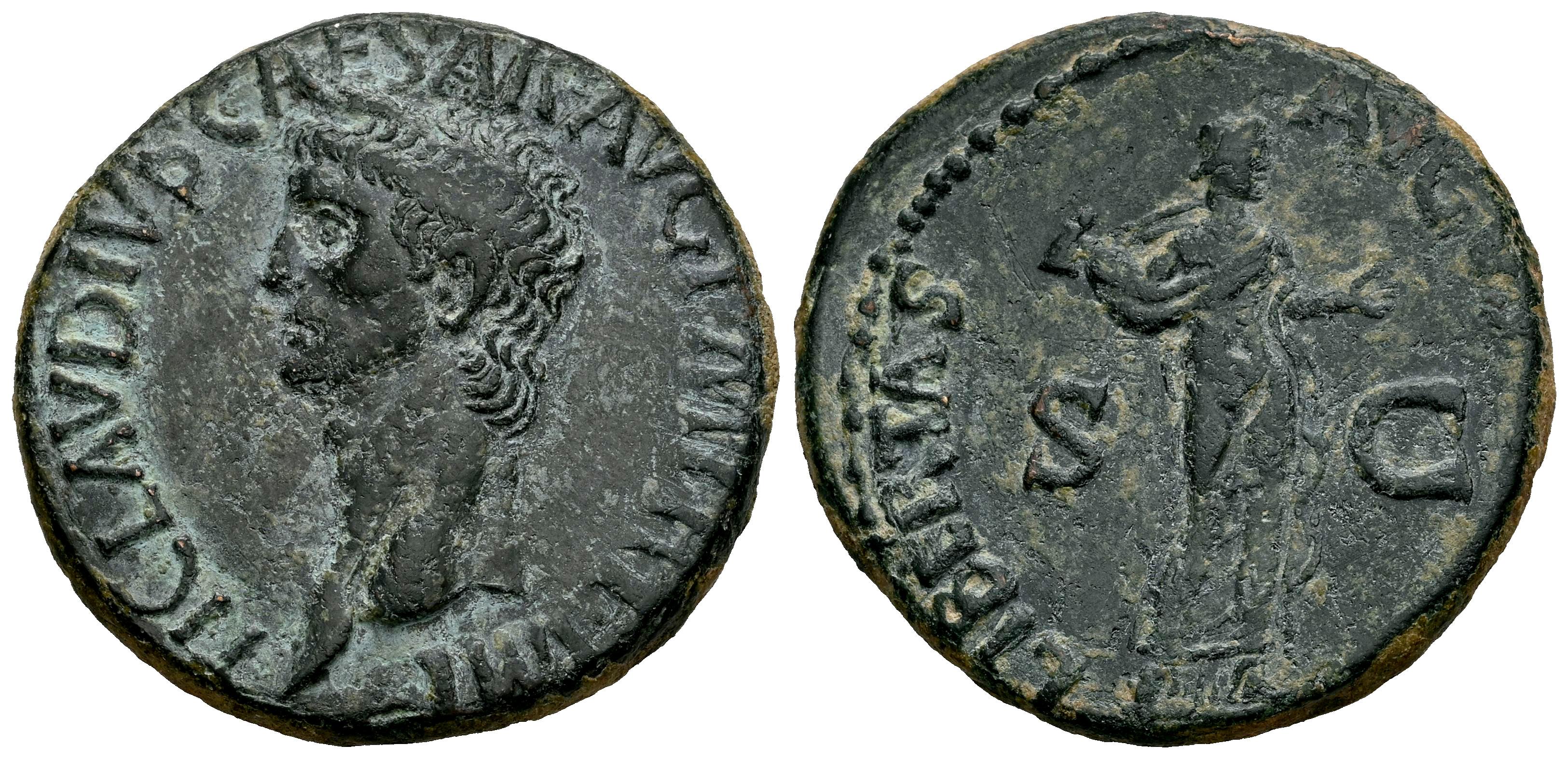 Claudius. Unit. 50-54 AD. Rome. (Ric-I 113). (Bmcre-202/5). (C-47). Anv.: TI CLAVDIVS CAESAR AVG P M TR P IMP P P, bare head to left. Rev.: LIBERTAS AVGV(STA), Libertas standing facing, head to right, holding pileus in right hand and with left outstretched; S-C across fields. Ae. 11,76 g. Choice VF/VF. Est...140,00.