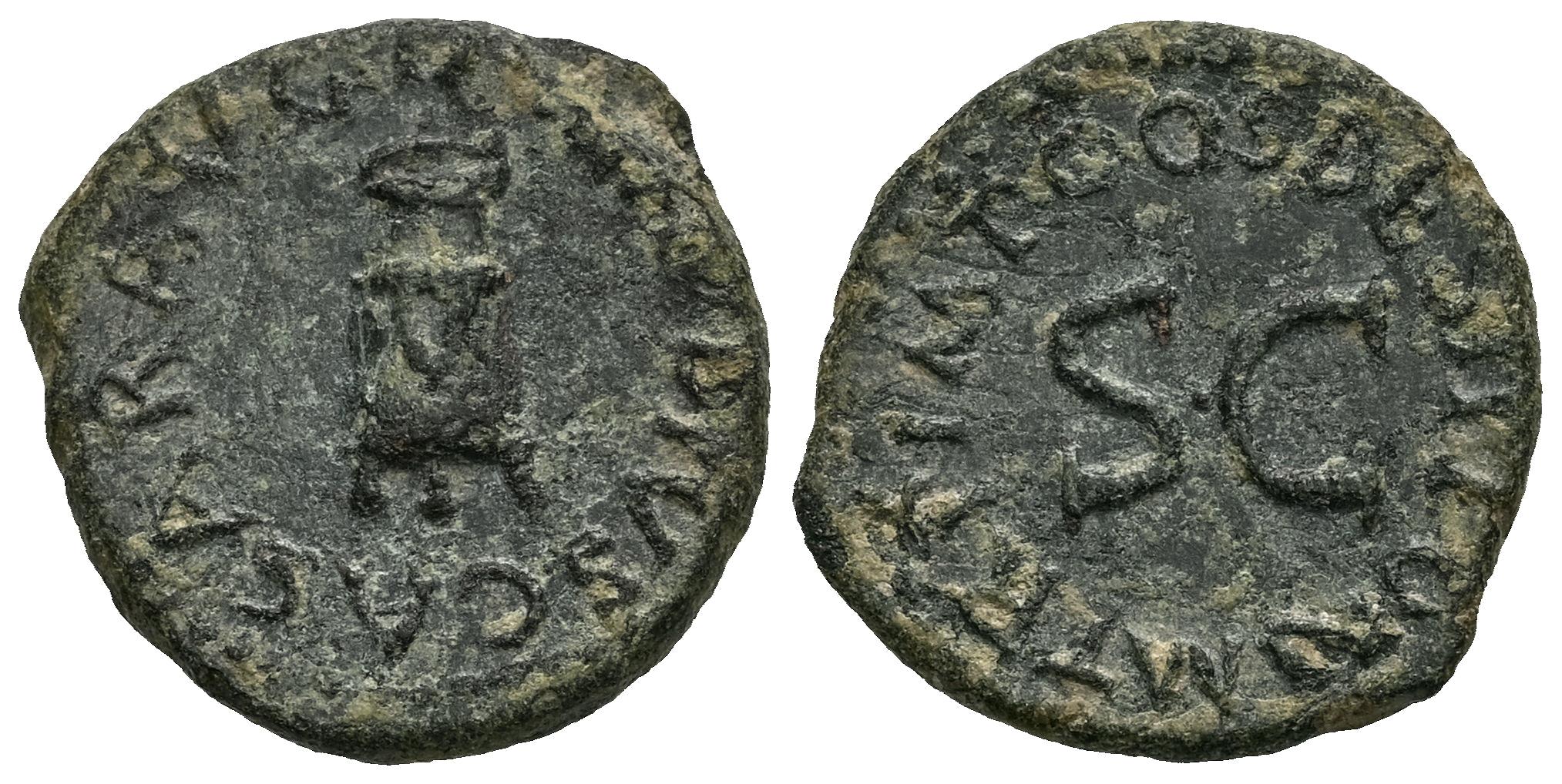 Claudius. Cuadrante. 41 d.C. Rome. (Ric-84). Anv.: TI CLAVDIVS CAESAR AVG. Three-legged modius. Rev.: PON M TR P IMP COS DES IT around large S C. Ae. 3,11 g. VF. Est...35,00.
