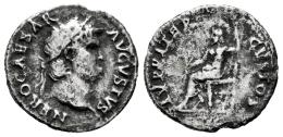 Nero. Denarius. 64-65 AD. Rome. (Ric-I 53). (Bmcre-74). (Rsc-119). Anv.: NERO CAESAR AVGVSTVS, laureate head to right. Rev.: IVPPITER CVSTOS, Jupiter seated to left, holding thunderbolt and long sceptre. Ag. 2,38 g. Severe roughness. Choice F. Est...60,00.