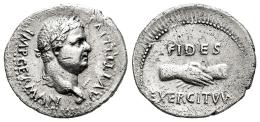 Vitellius. Denarius. 69 AD. Tarraco. (Ric-30). (C-31). Anv.: A VITELLIVS IMP GERMAN, laureate head of Vitellius to right, with globe at point of bust and palm branch before. Rev.: FIDES EXERCITVVM, clasped hands. Ag. 3,74 g. Porosities in metal. Faint scratches. Very rare. Choice VF. Est...1000,00.