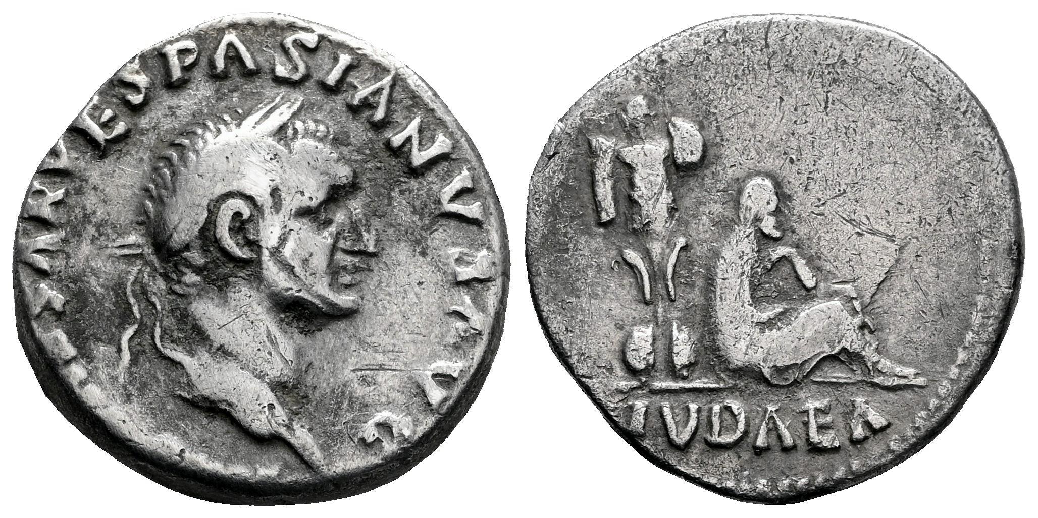 Vespasian. Denarius. 69-70 AD. Rome. "Judaea Capta" Commemorative. (Ric-II 1 2). (Bmcre-35). (Rsc-226). Anv.: IMP CAESAR VESPASIANVS AVG, laureate head to right. Rev.: Judaea seated to right against trophy; IVDAEA in exergue. Ag. 3,06 g. Almost VF. Est...120,00.