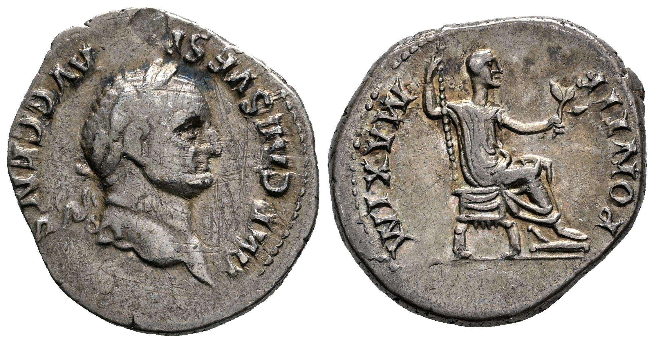 Vespasian. Denarius. 73 AD. Rome. (Ric-545). (Bmcre-p.19 note). (Rsc-387a). Anv.: IMP CAES VESP AVG CEN. Laureate head right. Rev.: PONTIF MAXIM. Vespasian seated to right on curule chair, holding sceptre in right hand and olive branch in left . Ag. 3,52 g. Scratches on obverse. Beautiful patina. Almost VF/VF. Est...120,00.